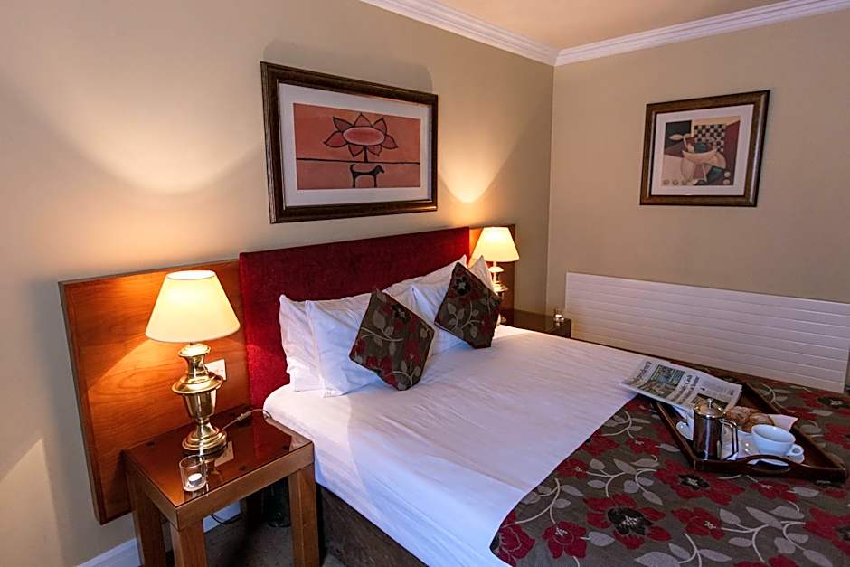 A bright room with elegant furniture and a spacious marbled bathroom.